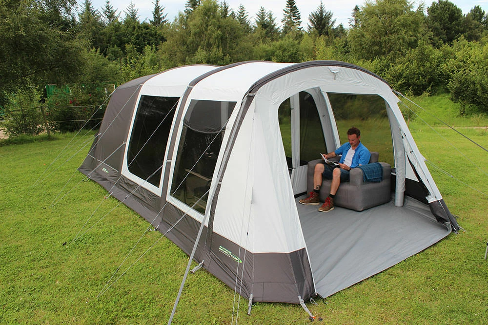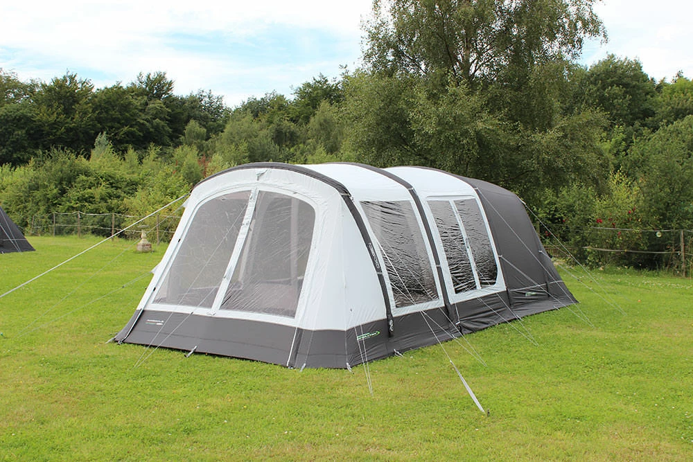 | Features | New Double Width Patio Style Side Door with Phoenix Mesh ventilation Valves: Dynamic Speed Valve for quick inflation and deflation. Rear Bedroom Vortex Ventilation system to reduce condensation. Integral Front Canopy Fully zip-around side door with mesh panel and zip vent. Tinted PVC Windows with zipped curtains. 5 Person Inner with Zipped Divider Includes storm straps for added stability when pitching. NEW darker bedrooms, offer a longer night's sleep by reducing early morning light. Front Zip to add additional canopy Adjustable Pegging system |