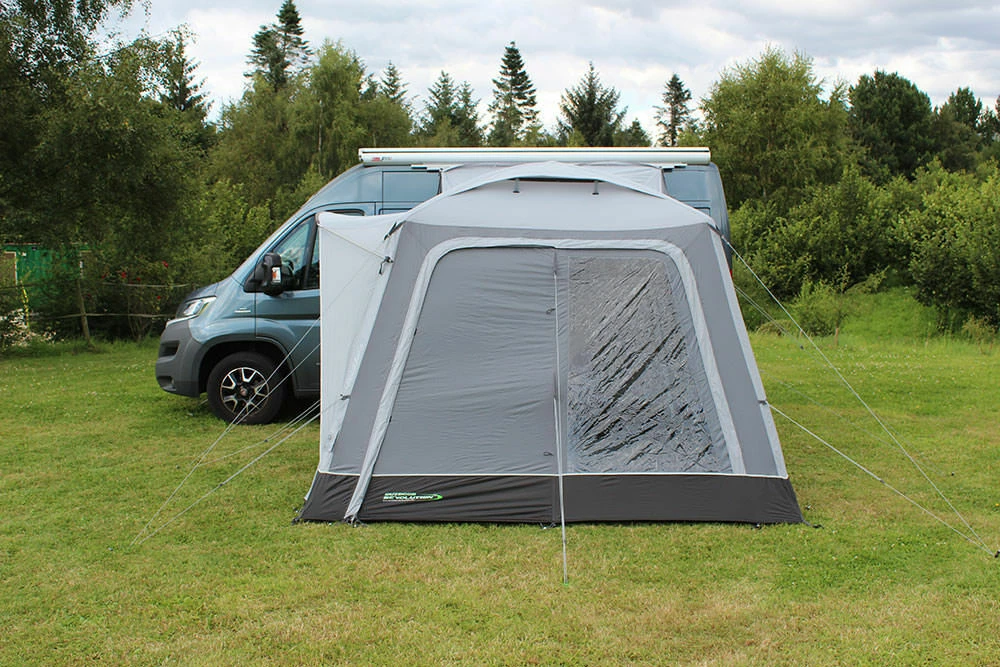The Outdoor Revolution Cayman Air is a superb value for money awning, available in several sizes to fit your camper van or motorhome. The Highline model is typically designed for motorhomes, or tall camper vans, and will fit vans and motorhomes between 255 – 305cm tall. The Cayman Air is classed as a “drive away” model, meaning the structure free-stands, allowing you to take the vehicle off-site, and reattach it upon your return. Further to this, it offers a lightweight design, making it ideal for touring campers, needing auxiliary space from the van.