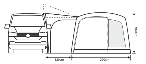 | Specifications | Continued by Outdoor Revolution Cayman Cacos Air SL Midline 120 HDE Polyester fabric – HH 3000mm – lightweight fabric made to deliver compact products but maintaining strength and durability, woven using the latest manufacturing techniques and a hex print pattern. Open Sizes: Height: 210cm / Length 590cm / Width 300 plus 120 for the fitting tunnel attaching to the van. Fitting Height 210-255cm Total Weight 21.2kg Twin connection piping designed to fit rails 4mm & 6mm |