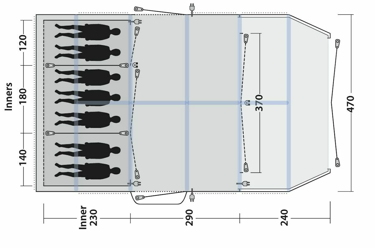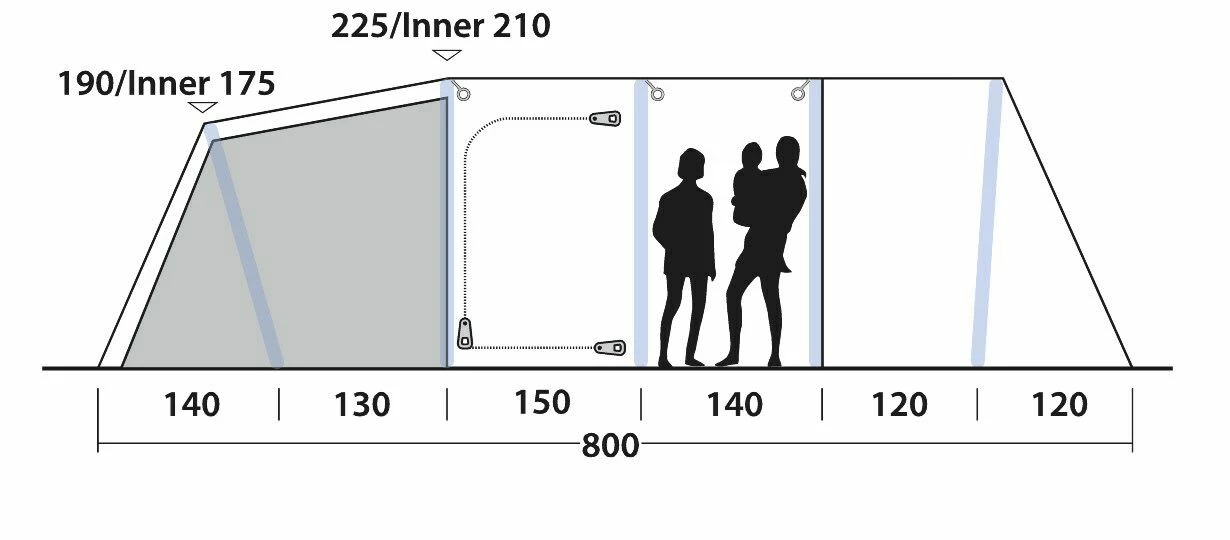 The Outwell Knoxville 7SA sleeps up to 7 people across three darkened Ambassador Master bedrooms with Quick & Quiet inner doors. it is large with three zones, so offers plenty of versatile living space. It provides two side doors, one of which has a Rain Safe canopy. There is also a Quick & Quiet door between the front zones, allowing easy access within the tent when the doors are closed to seal off the space. The Outwell HookTrack System also adds to the flexible design, allowing lights and other items up to 1.5kg to hang from or between the inflatable beams.