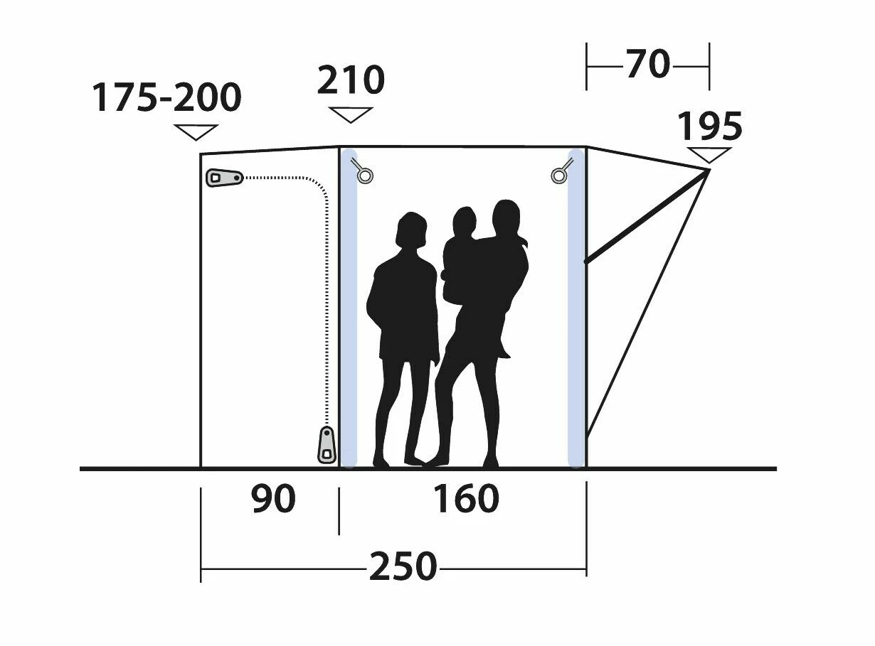 | Features | Designed for Campervans with a fitting height from 175-200cm Large front door with additional insect mesh screen HookTrack System allows versatile positioning of lights and other small accessories Large tinted windows for a light-filled interior with curtains for privacy Heavy Duty zips enhance performance Large front canopy to provide shelter from rain and sun glare Full open rear for easy access to vehicle Pre-attached luminous guylines for convenience and fast pitching Groundsheet for Link Access Zone with built-in draught excluder skirt |