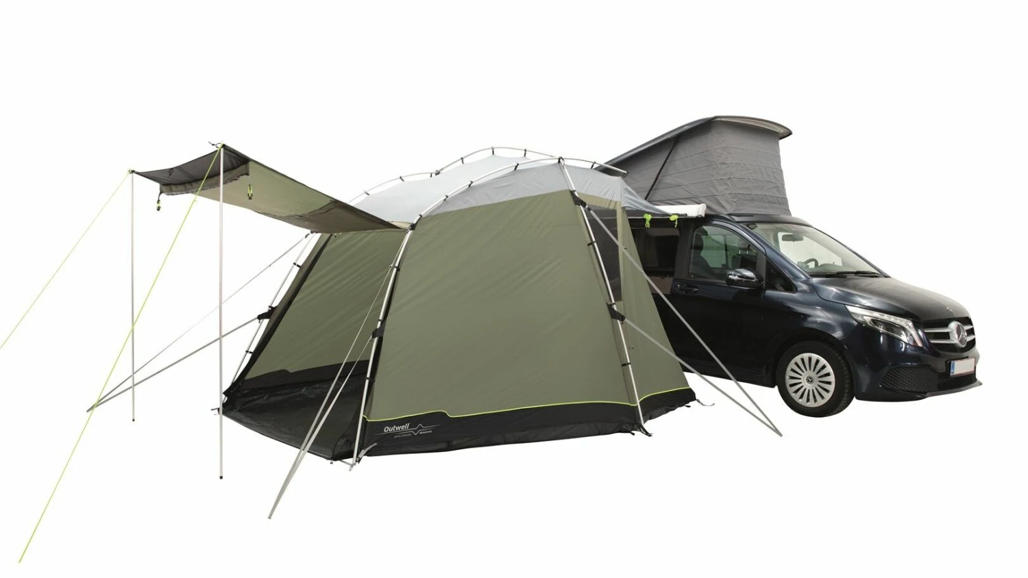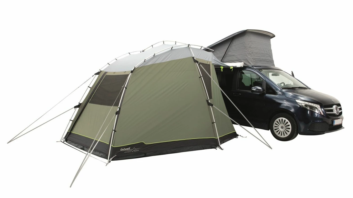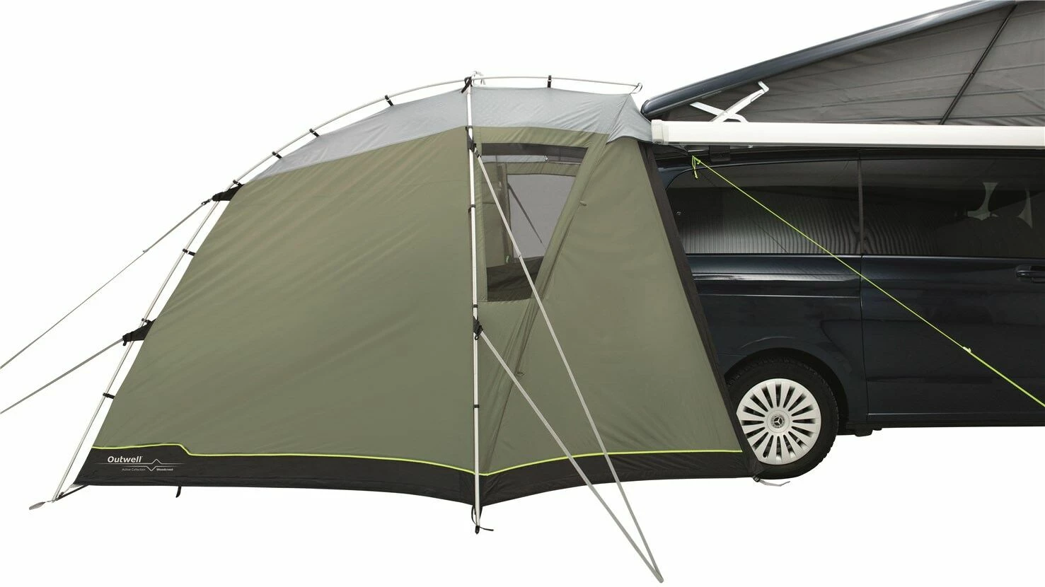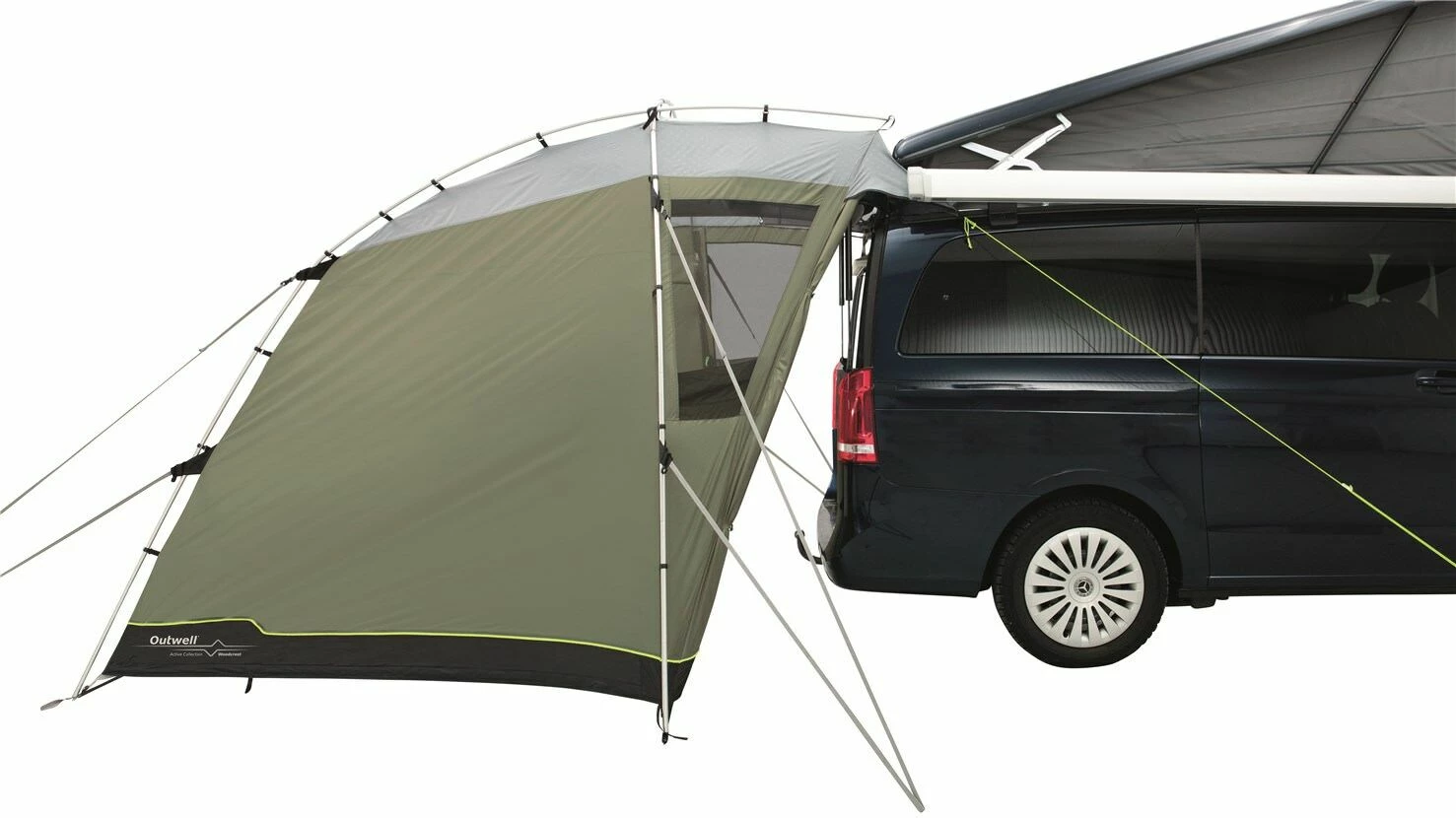 Designed for campers or cars, the Outwell Woodcrest is a versatile poled tailgate awning with a drive away design. The Woodcrest is the perfect companion for touring holidays due to the ease of set-up and set-down. It has a domed design will attach to vans with a height between 175 and 200 cm, and is able to fit either the rear and side of a vehicle to provide plenty of additional space to relax in comfort. The highly waterproof Outtex 3000 Select Flysheet clips onto the Aluflex System of pre-bent aluminium poles, to make it quick and easy to pitch securely, and to set it down afterward. The front and rear doors can also be rolled away or pitched out as canopies to enjoy the views or to create a fresh breeze.
