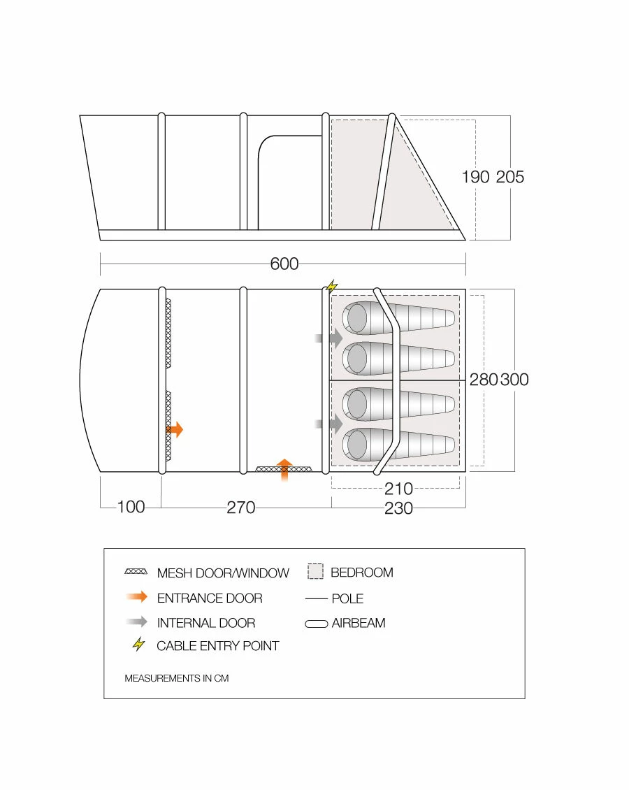 | Features | Vango AirBeam- Quick to pitch, providing a strong, rigid structure. Nightfall Bedrooms- ideal for a better night's sleep, as the bedroom compartments are darker, reducing early morning light. Mesh Doors- mesh to side and front door panels, which helps the tent to breathe, and reduces the amount of condensation. Furthermore, the mesh helps to reduce the heat inside the tent on a warmer day. Diamond Clear Windows- very clear windows which will help to increase the airiness and brightness of the tent. The windows also have a toggled curtain, to create privacy of an evening. TBS II Tension Band System- helps stabilise the tent in windier conditions – by creating a solid triangular structure. It is important not to overtension them. Villa Construction- taller side walls create greater space inside the tent, and greater standing height. Clear Access Bedrooms- A wider opening and no step over into the bedroom allows for easier access – also stops accidents, as less of a tripping hazard. Toggled Inner Divider- Allowing you to split bedrooms to create more privacy, or remove to create one large master bedroom. Flexible Door Step- The side door and front door drop down, which creates an easier access – ideal for prams and wheel chairs. King Pole Door- the doors have loops, and king poles (purchased seperately) can be used to create a canopy to the side of the tent. Air-Speed Valve- a tried and tested Valve – easy to inflate and deflate your tent beams. Vango AirZone- High and low level ventiliation panels create a comfortable flow of air through the tent, helping to reduce the effects of condensation. Double Action Pump Included – supplied with your tent, rolled inside the middle, complete with pressure gauge. Sewn-in Groundsheet- the groundsheet is sewn-in throughout the tent, but the tent does have drop down doors – so the groundsheet is not 100% sealed from bugs. Waterproof Groundsheet protects from the elements underneath the tent. Toggled Privacy Curtains provide windows with privacy of an evening. Double living area – or a three zone design, with a large integrated living space, and open front porch area – perfect for cooking or socialising. Easy Pack Carry Bag – offers a larger carry bag, which should make it far easier to pack your tent away. High Visibility Guylines, prevent tripping hazards, and offer additional stability to the tent in windier conditions. |