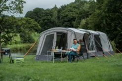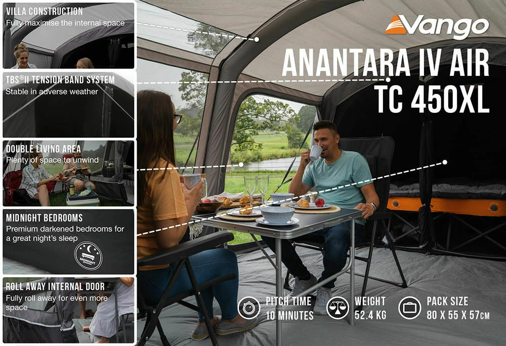 A stunning family tent perfect for smaller families or couples wanting masses of living space, the Vango Anantara IV returns for 2022, in a new size of 450xl, with a polycotton design. Loaded with great features, such as the new Single-Point inflation system, which allows it to be pitched from one valve. Combine this with the additional Turbopump (sold separately), and you can sit and relax whilst it inflates itself. The Anantara is famed for its three-zone design, which offers an abundance of living space, sleeping space and comfort. The design heavily focuses on mesh ventilation, to increase the comfort further, by having multiple mesh panel doors, and mesh panel windows, all of which promote a healthy airflow throughout. Finally, the brilliant Midnight bedrooms help provide a darker sleeping compartment, for a better night’s sleep, and making it easier to get the kids settled for the evening.