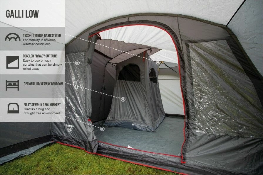 Perfect for VW Transporter vans or Ford Torneo vans, with a height of 180-210cm. The Galli I Poled awning is a budget version of the very popular Galli air awnings, designed to sit sideways onto the van, sitting parallel to the van to maximise the space on the campsite pitch. The Galli I features a fully sewn-in groundsheet, and can have two inner tents attached inside (sold separately) to give sleeping space for up to four people. Furthermore, it has a connecting panel, designed to cover the space between the awning and the van, which can be connected and disconnected from the van.