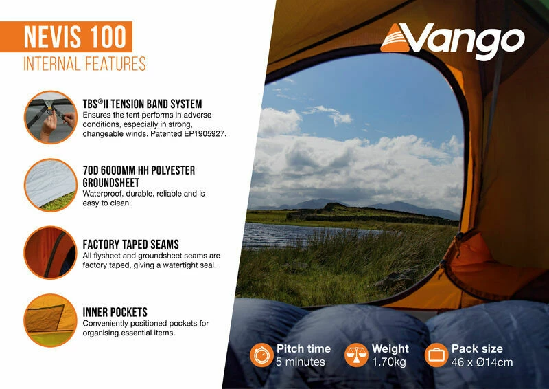 The Vango Nevis 100 tent is ideal for lightweight, compact campers, requiring a quick-pitching product for solo camping. Part of the Technical Experience range from Vango, the Nevis offers a great product at a value-for-money price, giving a gateway to camping. Using an alloy pole to retain the strength of the structure, and a durable 70 denier polyester flysheet fabric. The perfect option for Scout groups, Duke of Edinburgh schemes, or backpackers.