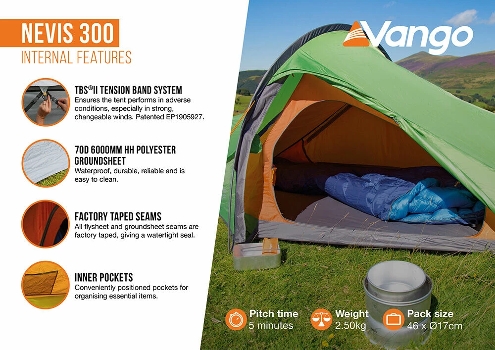 The Vango Nevis 300 tent is a compact, three-person tent with a lightweight design, fantastic head height, and a simple tunnel structure to pitch, which can be erected within 5 minutes. The Nevis has Powerlite Alloy poles to ensure it remains lightweight, with an overall weight of 2.5kg, whilst offering fantastic strength of the structure. Featuring Vango’s patented Tension Band System II to help stabilise the tent in windier, adverse weather conditions.