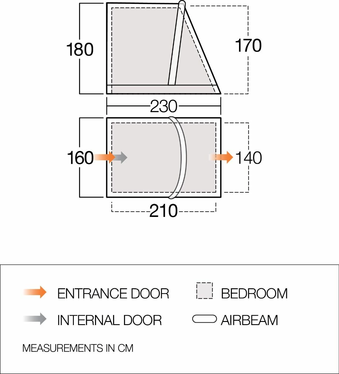 Simply unzip the side door and zip the annex into place, peg out the corners and inflate the singular beam.